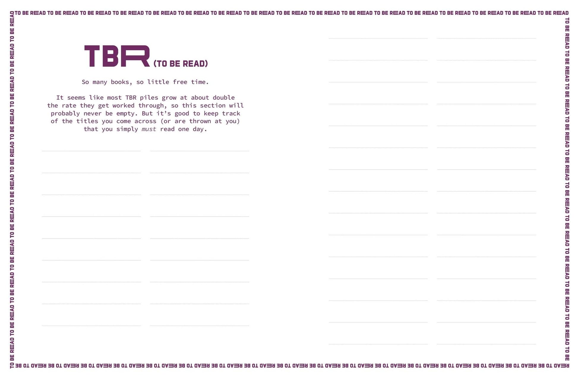 This reading journal is for those who like big books and need somewhere to collect their thoughts about all the books they love, hate, TBR, or DNF. Catering to the Booktok and Bookstagram communities and equally appealing to everyday readers and book club members, it features a fun, meme-able cover and an easy-to-use and compact format.