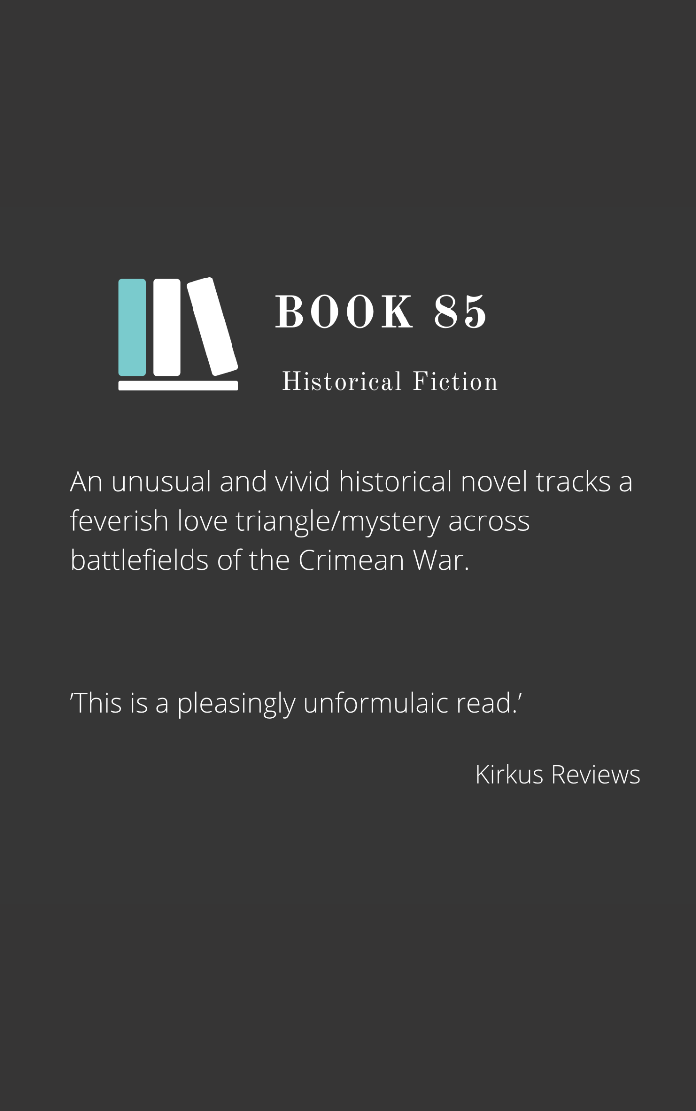 An unusual and vivid historical novel which tracks a feverish love triangle/mystery across battlefields of the Crimean War.